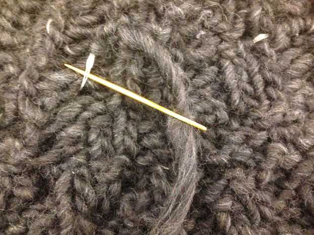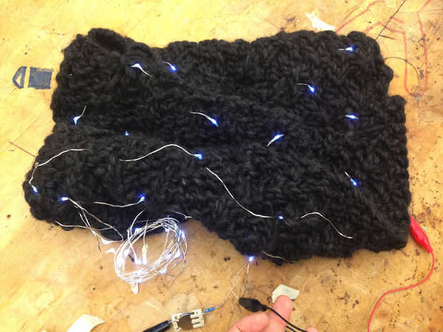 3. el usuario del otro extremo del hilo de hadas para tejer a través de su bufanda en cualquier patrón que desee. Opté por dispersión al azar los LEDs para hacer mi bufanda como el cielo de noche!