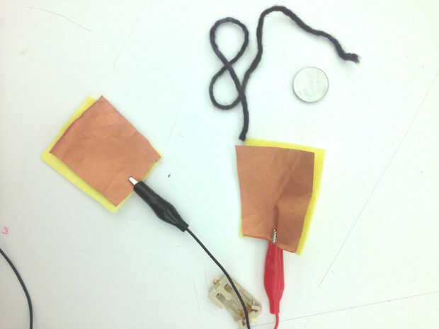 5. y coser el otro extremo de hilo conductor a través de la segunda plaza de la tela de cobre.
