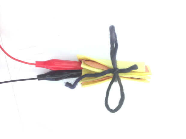 6. para encender el hilo de hadas de LED, hacen los dos plazas táctil. Para mantener el interruptor en, usé hilo para unir las dos piezas. También se puede utilizar un alfiler.