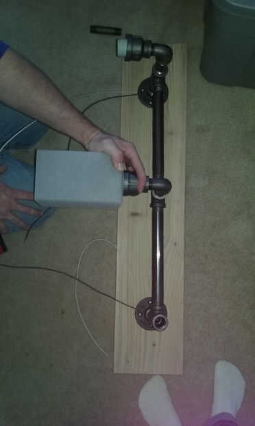 En este punto, lo que debería haber hecho es montar la parte de montaje de la tubería negra (brida del piso, pezones de 3 pulgadas (8cm), tes y pezones 8 pulgadas [20cm]) con el fin de centrarlo en el tablero y marque mis orificios. Después de hacer esto perforé dos agujeros de ¾ pulgadas (2cm) detrás de las bridas de piso y 8 agujeros para el montaje de las bridas de piso. También taladrar cuatro orificios para los tornillos, seleccionando su posición determinando donde la Junta montaría a un poste.