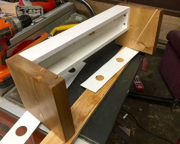 Tenga en cuenta que tenía que tomar en cuenta la necesidad de la luz a cubrir el agujero en la pared. Usé un trozo de madera pintado de blanco con una sección transversal triangular por debajo de la caja de madera contrachapada. No aparece en el plan o las fotos porque he añadido después, una vez que yo sabía exactamente cuánto necesitaba ser.