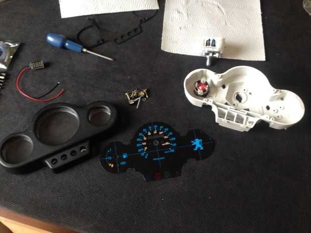 De todas las partes que se reunieron los mejores y empecé a modificar velocímetro, iniciado por taladrar agujero en cubierta principal y tomó Lima de metal y alisar los bordes donde va el voltímetro. Entonces tomó la tira de Led de 12v y lo hizo todo de shell.