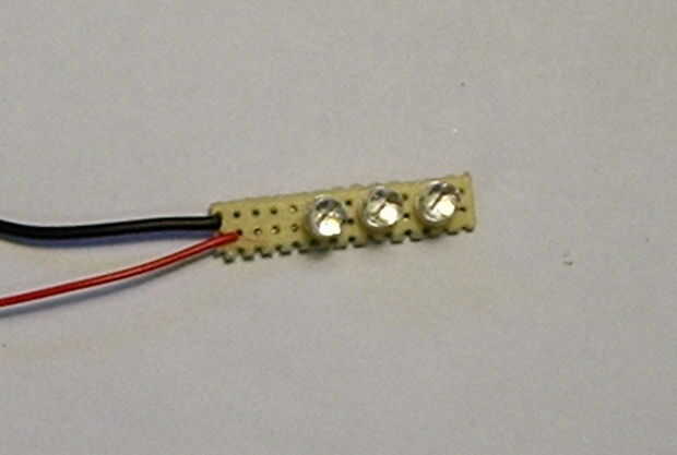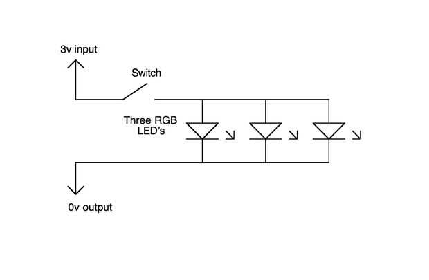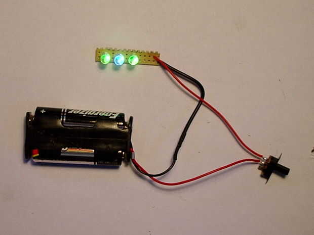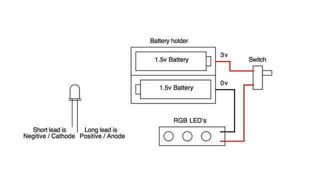 Soldar los LEDs RGB en paralelo sobre la veroboard. Soldar el interruptor entre la salida positiva de las baterías y el lado positivo de los LED. Luego soldar el lado tierra del LED al cable negativo de la batería. Es simple.