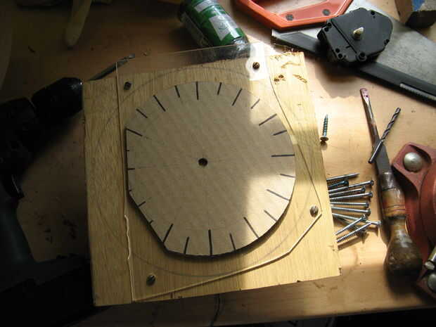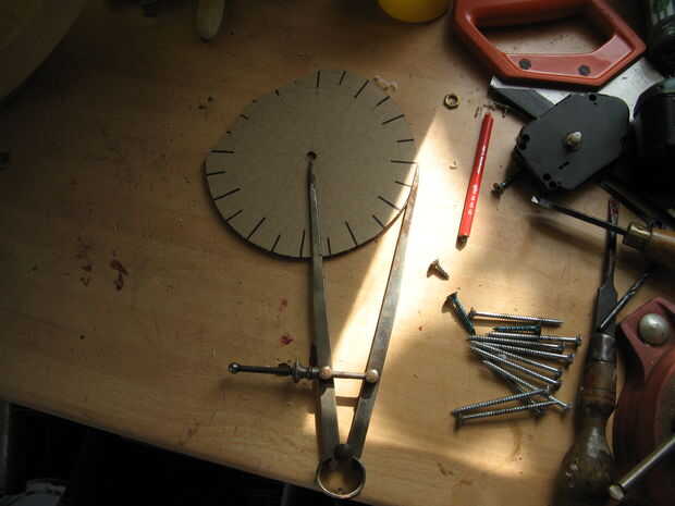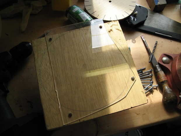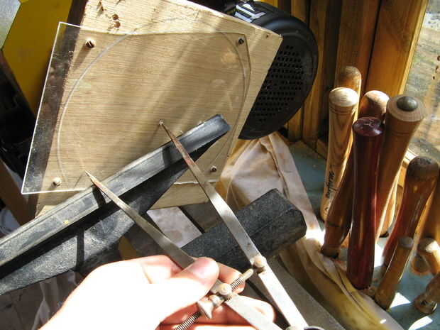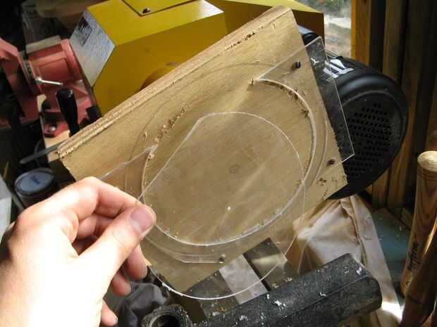 Adjunto el persex a un pedazo de madera contrachapada, montado en el torno, marcó el punto de centro y utiliza un par de divisores (sólo puede utilizar una regla si no los tienes) para marcar el diámetro a cortar en el plexiglás y luego utiliza un escoplo de torneado estándar para cortar el disco.
