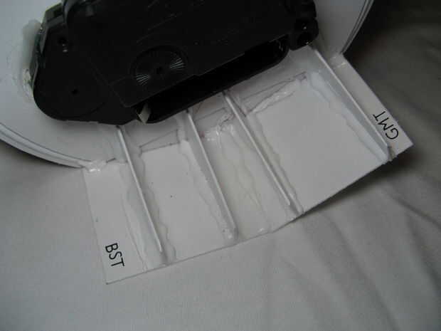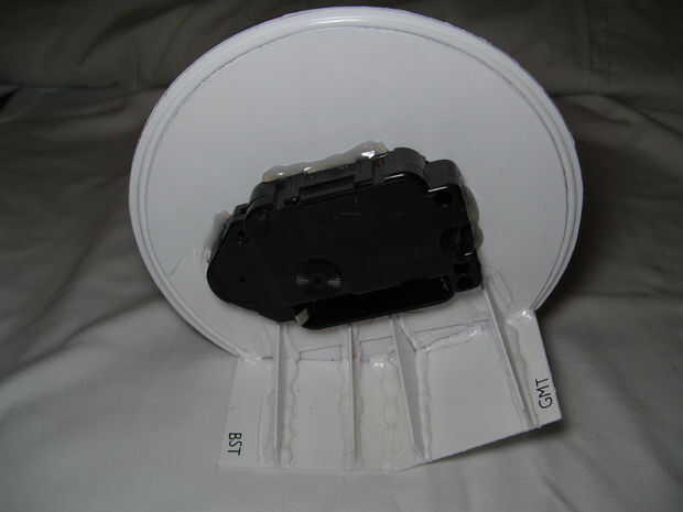 La cara se intercala entre el frente y la parte de atrás y todo es sostenido en lugar por la tuerca sobre el movimiento de reloj de cuarzo, luego pegué el movimiento para prevenir movimiento y por lo tanto contando una hora incorrecta.