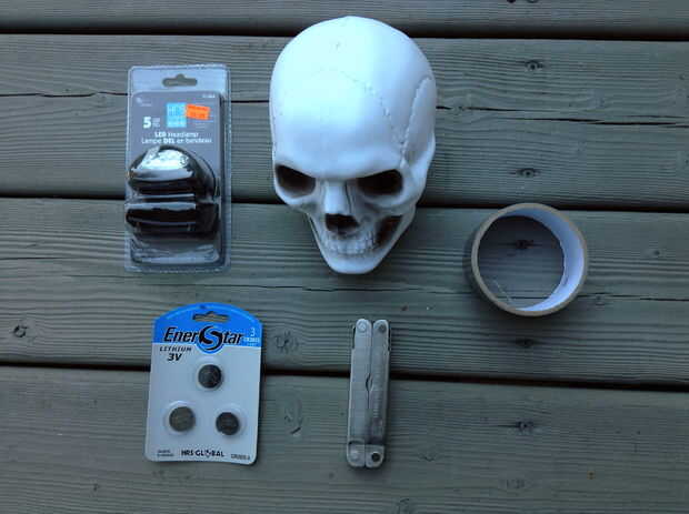 -Un cráneo de plástico hueco, translúcido (preferiblemente blanco) -Un proyector LED barato con un parpadeo/configuración -pilas de botón 3 voltios (yo usé pilas cr2025) -Una herramienta multiusos o una navaja y alicate -Cinta