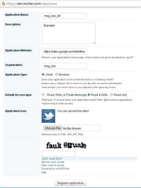 Ya después de haber creado mi cuenta de Twitter luego fui aquí info de contraseña https://dev.twitter.com/apps/new para obtener mi OAuth . Revisión de las tres imágenes adjuntas de los formularios.