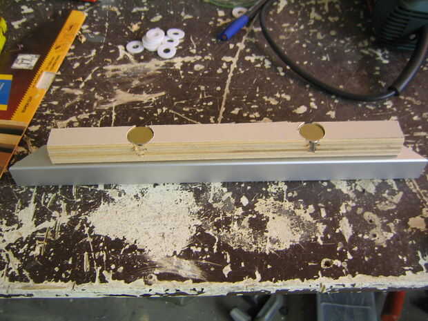 He creado un soporte para los imanes comprados. Por lo tanto, simplemente he perforado los agujeros en una vara de madera y coloca el imán en allí. Las varillas de montar perfectamente en el perfil de aluminio.