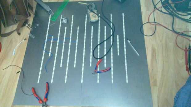 El material eléctrico es muy simple. Pegamento en las franjas de LED y conectar con los demás. Para obtener una mejor distribución lumínica, de esta manera he incrementado los gastos de funcionamiento en un 200%...