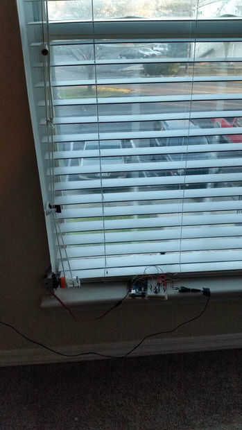 El objetivo de este proyecto era convertir normal 2" madera listón persianas persianas en"smart"persianas que abren automáticamente durante el día y cierran por la noche. Hay dos botones que permiten que las persianas que temporalmente abrir o cerrar pasando por alto el estado de la luz. Además, un receptor de 433 Mhz RF permite control manual de las persianas si lo desea. Un transmisor de 433 Mhz se utiliza en conjunción con una Raspberry Pi para habilitar el control del teléfono inteligente. Hay muchas maneras de hacerlo más elegante, pero quería usar las piezas y herramientas tuve puesta alrededor. El resultado es un sistema de control de persianas de bajo presupuesto, muy capaz que se ve terrible pero funciona muy bien!