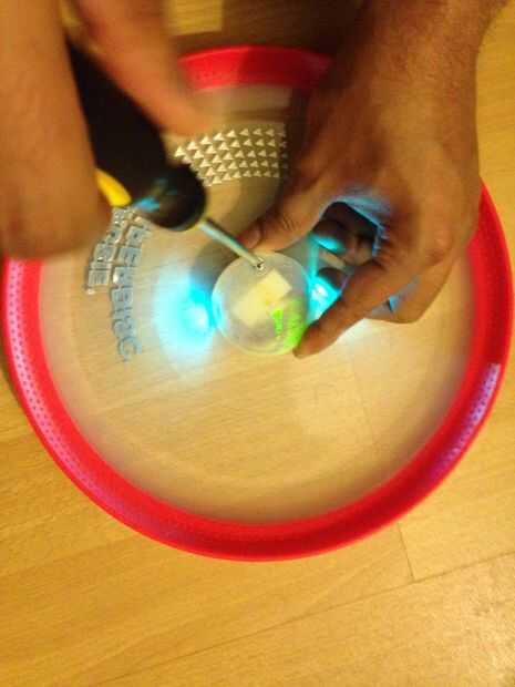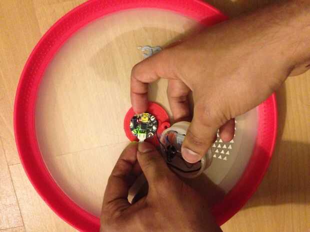 Con un 32 x 1/2 tornillos y un destornillador asegure la base a la tapa del frisbee como se muestra en la foto de arriba.