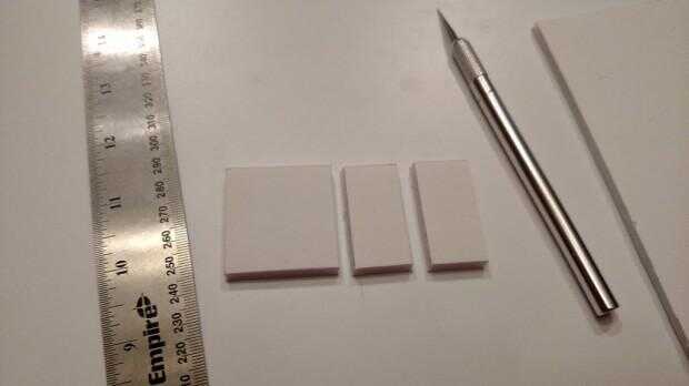 2. Corte como se ve en la imagen. Las dos piezas más pequeñas (40 mm x 20 mm cada uno) se convertirá en las pinzas que abrigo sobre la pared de la pista para mantener el soporte en la pared. El pedazo restante (40 x 40 mm) se convertirá en la plataforma que sostiene el LED.