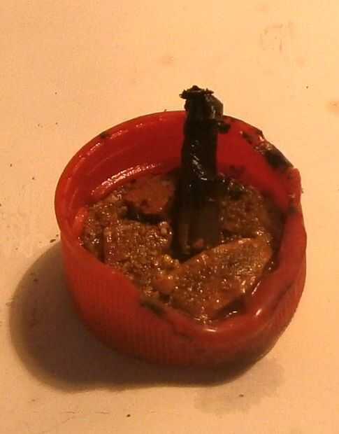 Aviso: Estamos metiendo una llama dentro de envases inflamables y por tanto hay peligro de incendio. Se debe actuar con seguridad, no dejar nunca el quinqué pecado vigilancia y en caso de el plástico se deforme, o se prenda apagar todo inmediatamente. Por suerte, el aceite, tal y como lo usamos aquí no es demasiado peligroso pues solo se calienta el sube por la mecha, pero aun así donde hay fuego hay peligro, y por tanto ha de actuarse con responsabilidad. Como muestra, arriba, un tapón comenzó a arder al caer la mecha un lado de las Naciones Unidas.