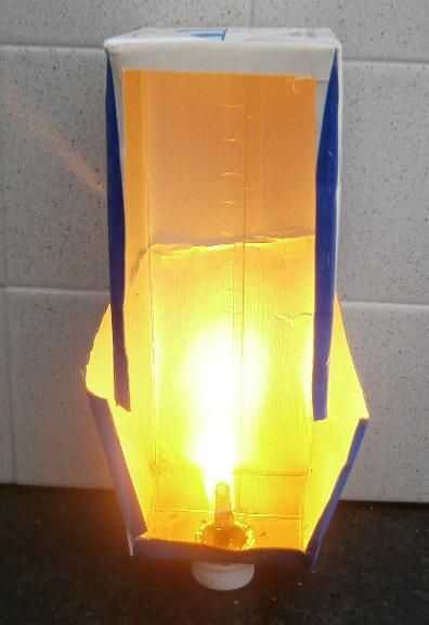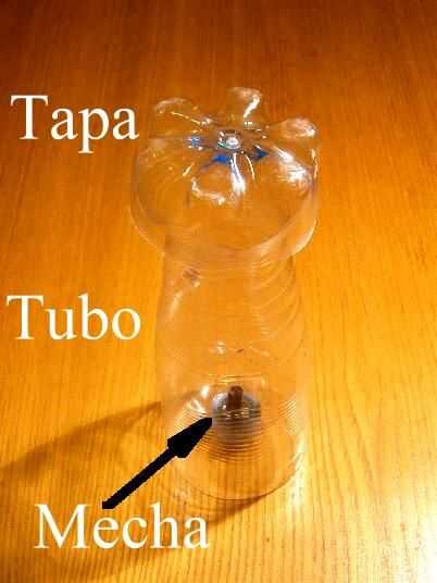 En este caso cortamos la botella en tres partes, un corte cerca del cuello y otro cerca del fondo. Si el cuello es amplio podemos mantener el tapón en su sitio, sino montaremos la mecha en el propio tapón. El cuello afianzado o el tapón con la mecha se colocan sobre una base de físico-matemáticas y se prende... La parte central invertida, sirve de tubo de protección de la llama y el fondo se puede usar para tapar el conjunto, pero separándolo del tubo para haya una buena circulación del aire caliente.