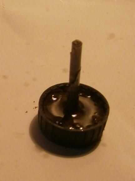 En este caso optado por una mecha diferente; con un trozo de papel se forma un canutillo fino, pero pecado apretar. Se coloca vertical en el tapón y se compadrazgo con un poco de barro, sal, papel de aluminio etc.. Se impregna la mecha vertiendo aceite por el interior del canutillo hasta se forme un charquito en el fondo. Se prende la mecha y si es necesario se va par aceite a medida se consuma.