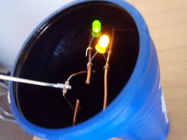 Asegúrese de que la batería está conectada al lado con el cable pequeño. Los LEDs necesitan una resistencia para evitar ser quemado para arriba. En la foto con el LED encendido, la batería está conectada a los cables en la parte inferior de la imagen. Si la batería está conectada al cable en la parte superior de la imagen, los LEDs se queman inmediatamente.