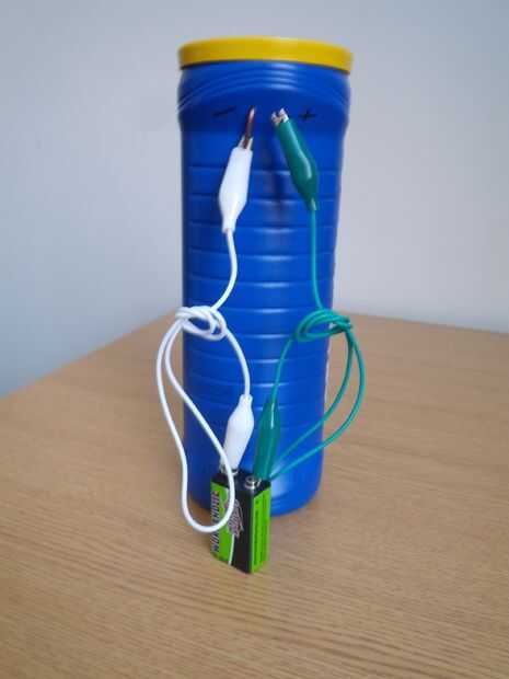 Enganche el clip de papel/resistencia a través del agujero en la tapa. (Cinta si quieres) Coloque la tapa sobre el recipiente.
