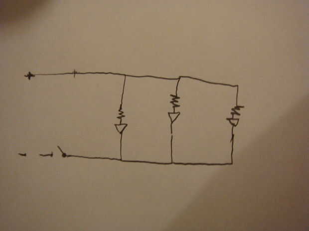 Cada LED necesita una resistencia. Calcular basado en la tensión de alimentación nominal (con V = IR), si estás usando una wallwart como soy utilizar la tensión nominal en él (real es mayor porque su no reglamentada).