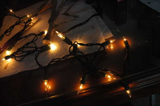 Así que en vez de eso decidí usar algunas luces de Navidad LED (que son más pequeñas y que emiten mucho menos calor) que tenía que meter en a través de la parte posterior con un método demostrado en las fotos. Esto funcionó magníficamente.