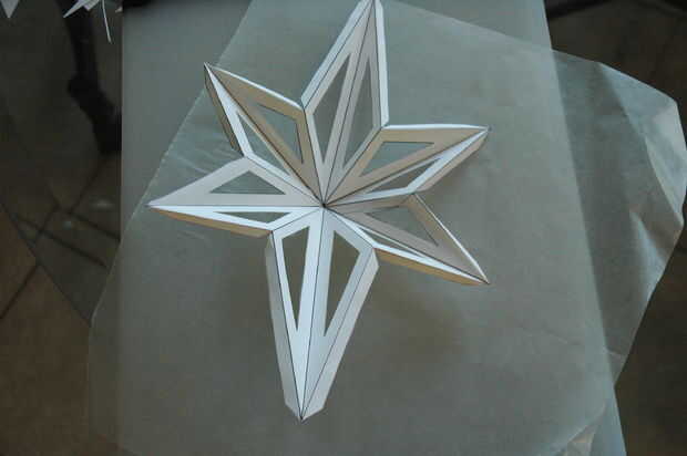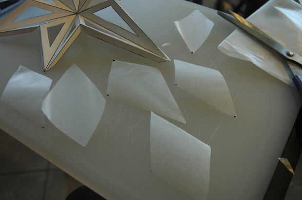Use la placa estrella para medir formas de cometa en el papel de cera. Más tarde estos actuará como paneles que difunden la luz dentro de la estrella.