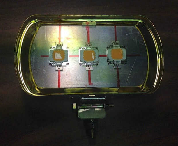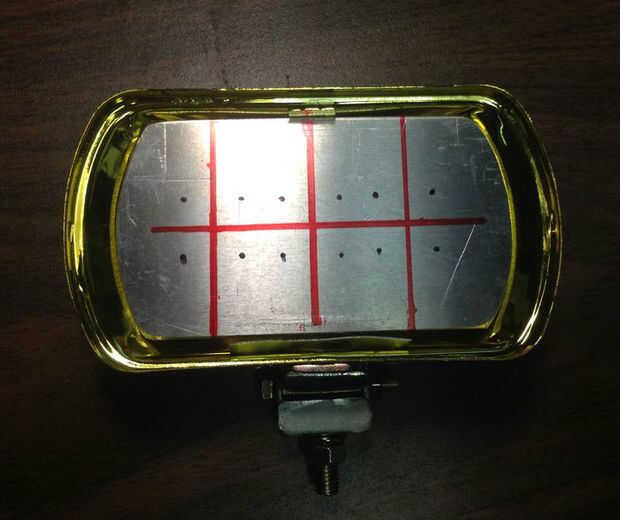 Tuve unos 10 vatios virutas del LED. Trabajan bien en un coche con sólo una resistencia de 2,7 ohmios serie. Usted puede ir con un conductor actual constante pero en este caso no permanecen en el 100% por lo que no te preocupes. su generalmente un deber de 50-50 ciclo cuando están en uso. Me decidí por 3 Leds por luz. Corté un trozo de placa de aluminio 1/8 para que coincida con el contorno de la caja. He utilizado una sierra de cinta delta pero funciona incluso una sierra para metales.