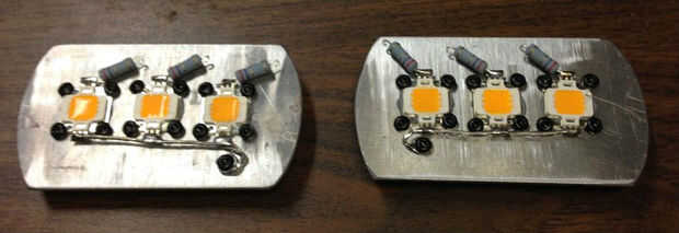 Presentado tres leds centrados en el centro de la placa. He intentado conseguirlos centrado detrás de las diferentes secciones de flautas en el centro de la lente. Un poco de disipador de calor de grasa, debajo de cada uno ayuda a mantenerlos frescos. Algunos hardware de 6-32 los mantiene en su lugar.