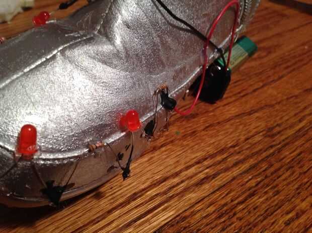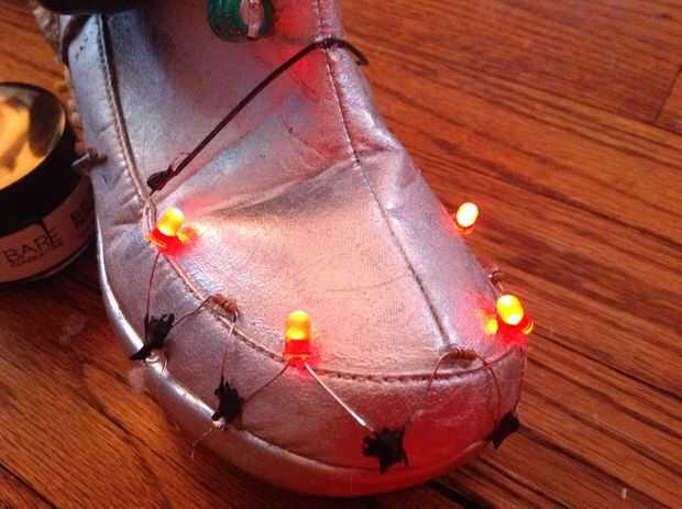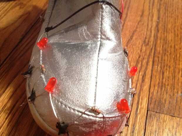 Una vez que ha hecho esto, puede pegamento caliente todos los componentes de. Te recomiendo que uses una pistola de pegamento de alta temperatura de la batería, si no se caiga. Después de que el pegamento esté seco, pinte las conexiones entre los componentes con pintura conductora. Es necesario utilizar grandes globos de él de lo contrario no conducir muy bien y los LEDs será tenues. Cuando usted no está usando la bota, sólo desabrochar el cierre de la batería y lo resnap la próxima vez que usted los usa.