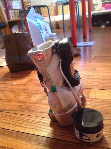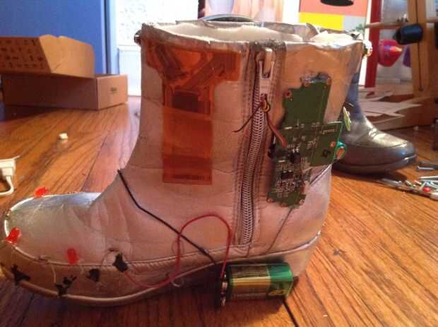 Esta parte probablemente será muy diferente dependiendo de quién lo hace, como todo el mundo tiene diferentes partes. Si usted tiene cualquier electrodomésticos viejos que no necesita, desarmarlos y usar sus tarjetas de circuitos y otras piezas de aspecto interesantes. Algunos aparatos pueden ser peligrosos para desarmar, por lo que es una buena idea a google si tuyo son antes de llevarlos aparte. Una vez que tengas suficientes piezas puede disponer su diseño y caliente pegamento en. Lo hice en la generadora bota demasiado, y pegué el cargador a un lado. Si se tratara para cargar que un teléfono celular como el Instructable sugiere, podría hacer algún tipo de soporte para lo que se fija a la bota.