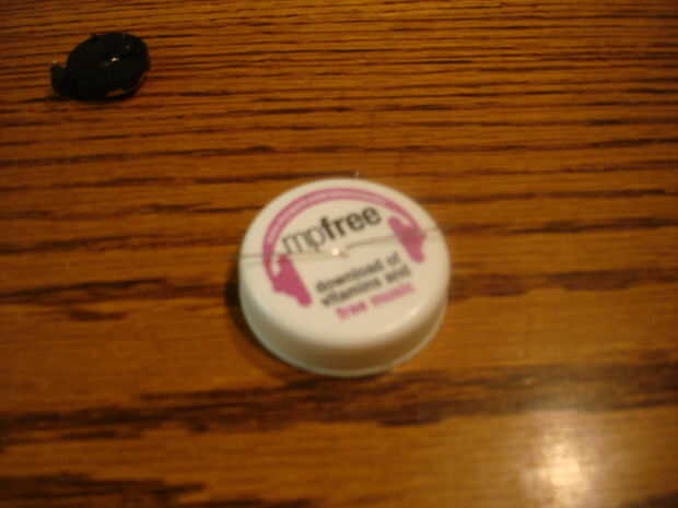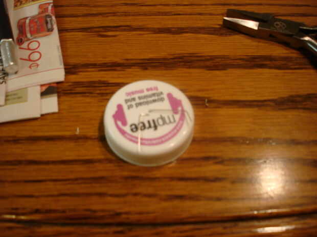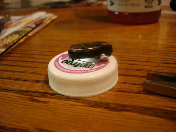 Doblar las puntas en el LED abajo de plano a la tapa de la botella. Aquí es donde yo debería haber soldado y probablemente será eventualmente. Estaba ansioso de poner esto para ver lo que parecía. También, a añadir un interruptor, para no tener que seguir tomando la batería para apagar esta cosa. Otra vez, tuve suerte en el ajuste de la tapa de la taza del ojo, ni siquiera tenía para ellos en la cinta. Su kilometraje mi vary.