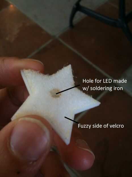 Cuando usted une el velcro a la parte posterior de la 3D impreso que cubre la cavidad que el LED se apoyará en estrellas. Para volver a abrir este uso mantenga el soldador caliente para quemar a través de la parte posterior del velcro, esto creará un agujero aseado y limpio para que quepa el LED. ADVERTENCIA: el soldador está suficientemente caliente para derretir/grabar a través de su estrella impresa 3D. Sea muy precavido al hacer este paso. Evitar que el soldador en contacto con cualquier parte de la estrella. También, para evitar dañar su soldador Asegúrese de que usted limpie la punta de cualquier adhesivo antes de dejar que la plancha se enfríe.