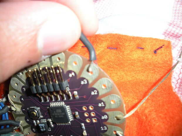 Tomar los cables positivos de cada uno de sus seis LEDS. Mirando desde el exterior de la camiseta, la estrella de la izquierda debe conectarse pin 8 en el arduino. El LED directamente a la derecha de la última estrella debe conectarse al pin 9 en el arduino. El siguiente LED al pin 10 y así sucesivamente y así sucesivamente hasta el último LED está conectado al pin 13 de arduino.