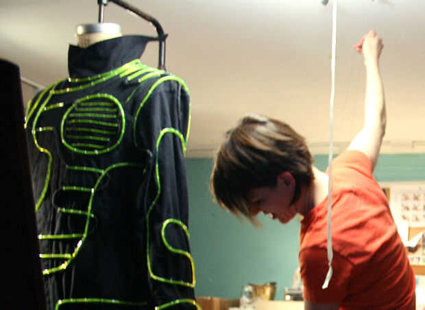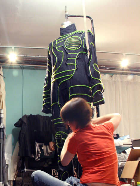 Para el casco, cosí el cable en el tramo negro, tejer a la tela que he utilizado para cubrirlo. Puesto que la tela era una malla deportiva, era fácil ver a través, pero imposible de ver.