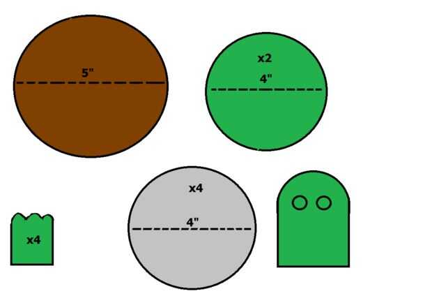 Ahora recortar las formas de la tortuga. Corte: círculo de fieltro marrón de 5", 4" verde círculo, x4 4" edredón relleno círculos, x4 las piernas y 1 cabeza.