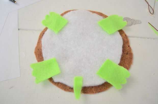 Coloque los trozos uno encima del otro en este orden: marrón de fieltro, 2 almohadillas de relleno del edredón, patas y cola, 2 más almohadillas de relleno y luego el fieltro verde.