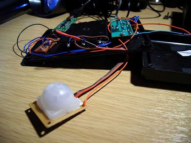 He conectado la energía positiva al interruptor integrado al controlador de luz. El cable de tierra va directamente al lado negativo de la bahía de la batería. El cable positivo original para el sensor PIR es pegado para que no corta nada. La salida analógica del sensor va a A1 entrada analógica en el Wee. En este sensor en particular, es baja)
