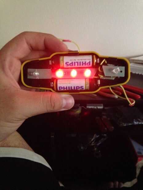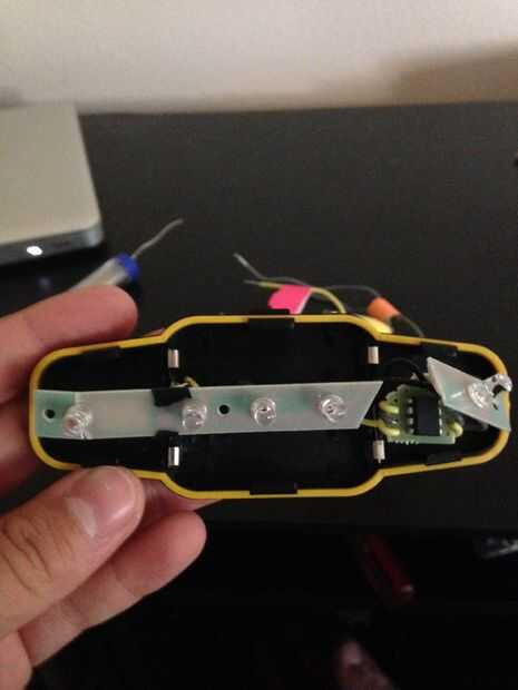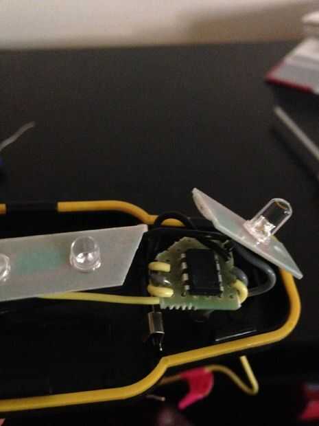 Ahora tenemos que cortar el protoboard con el ATtiny85 para caber en el lado derecho de la Asamblea, como se muestra en las fotos anteriores. Una vez que has conseguido un empuje ajuste ajustado bien los cables a través del orificio recién perforado. Ahora podemos empezar a conectar los cables a los LEDs