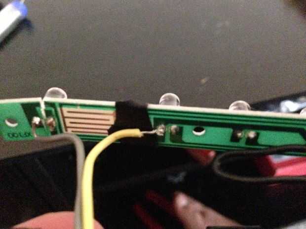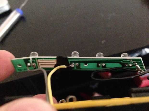 En el LED amarillo de la izquierda hay un camino que conecta con el poder. Tenemos que romper ese camino como se muestra en la primera foto. Luego suelde otro 1 pie 6 pulgadas cable al borne positivo de ese LED.