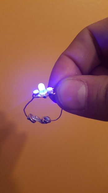 Luego tomar el extremo positivo de la batería y soldadura al alambre de cobre que conecta con el extremo positivo de los LEDs. Lo mismo para el cable negativo y el extremo negativo de la batería.