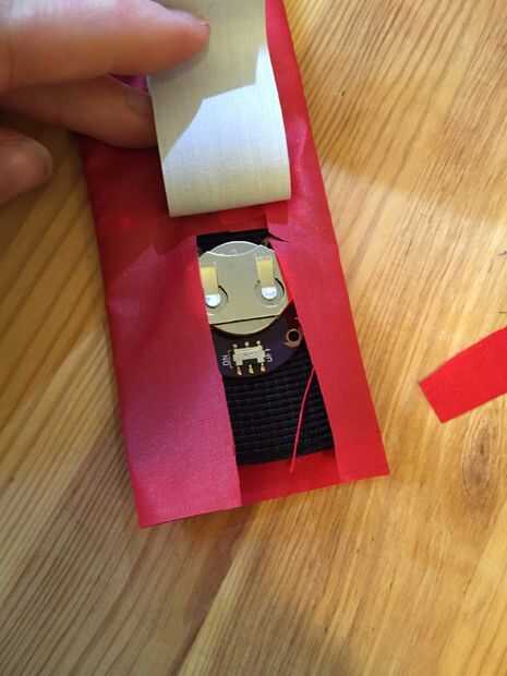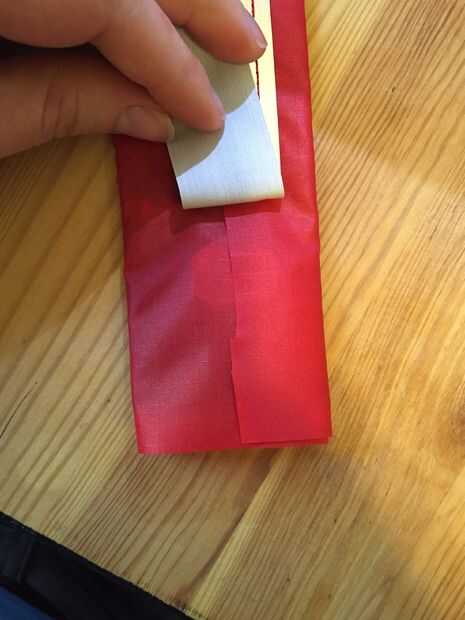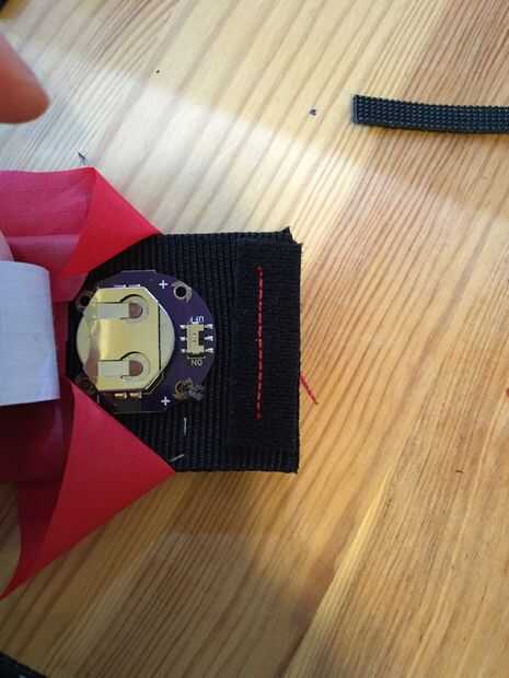 Entonces tiré de vuelta la tela para coser un pedazo de velcro a la cinta. Luego cosí un trozo pequeño de velcro en la orientación opuesta en la parte posterior de la pieza reflectante.