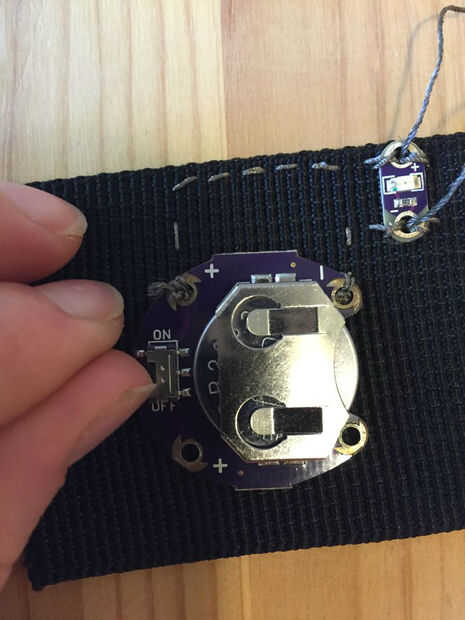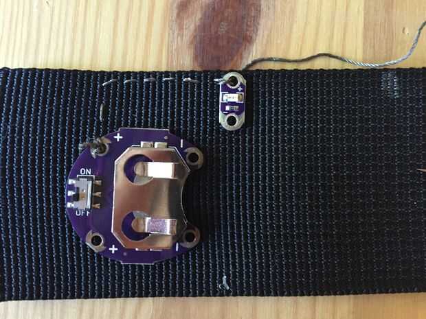 A continuación, repita el proceso para el lado negativo con un nuevo hilo. Asegúrese de establecer una sólida conexión con la batería y utilice pequeñas puntadas para coser hacia el primer LED.