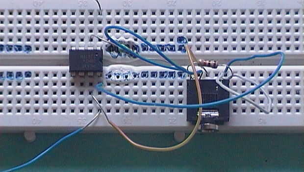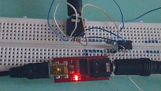 Primero necesita programar el microcontrolador PICAXE para esto se necesita un programador de sparkfun compré por $14 es el más barato USB Programador de PICAXE que encontré y usted tendrá que descargar el editor de programación de PICAXE. Configurar editor m 08 2 de programación modo y seleccione en el Prot de COM adecuado. Para programar el PICAXE necesita hacer el circuito de descarga que se compone de tres cables. Un cable envía los datos desde el ordenador a la entrada serial de lo PICAXE, un cable transmite datos de la salida serial de lo PICAXE al ordenador, y el tercer cable proporciona una tierra común. He añadido un esquema del circuito de descarga. Usted también necesita externamente fuente 4.5v alimentación el PICAXE y programación (mi programador necesita un suministro externo suyo no necesita uno). Hice el circuito en un protoboard que se puede hacer en un protoboard. Quité los carriles de la energía de mi tablero ya no se permite que el cable en el jack de audio.