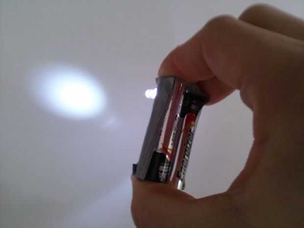 Para encender la luz, simplemente apriete la parte superior e inferior, llevando los cables de LED en contacto con los terminales de la batería. Puede tomar algunos alrededor de toquetear, pero debe poder encender apretando ligeramente la luz y apagarla por soltarlo.