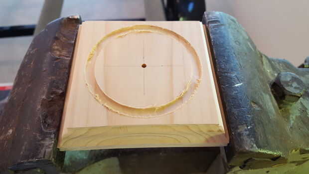 Para la parte superior de la base donde se asienta la botella, usé mi Dremel y un 1/4" recto enrutamiento poco junto con la plantilla de corte del círculo. Esto me ha permitido para un área de círculo perfecto de la botella.