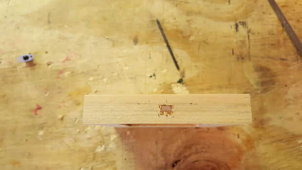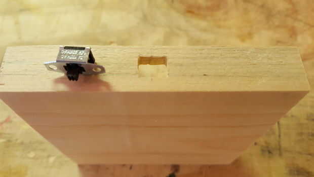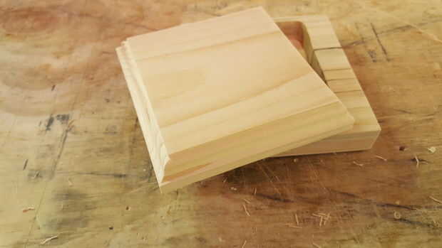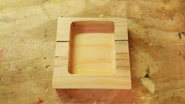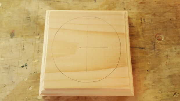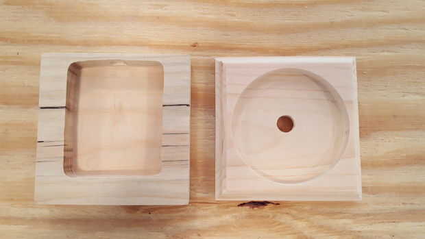 Usé madera de pino espesor de 3/4" para mi base. Cortar dos cuadrados que tenían una longitud de lado de 4.25". La longitud del lado de su base de madera dependerá en última instancia, el diámetro de la botella de licor. Una vez cortadas, dirigen los bordes de la pieza superior de la base de madera. Entonces, envían un área en la pieza superior de la botella de licor en. También colocar un espacio en la pieza de la parte inferior de la base para llevar a cabo los componentes eléctricos.