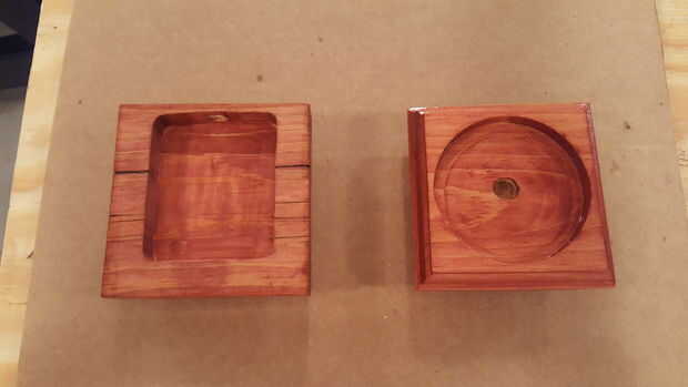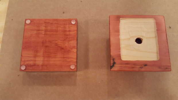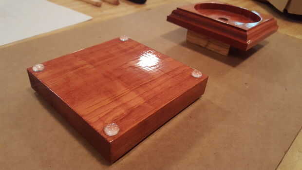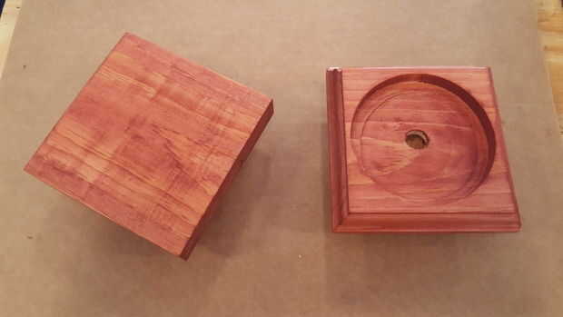 Ya que estaba usando Rosa LED, pensé en que un tipo de mancha rojiza se vería bonito/elogio la luz rosa. La mancha de madera roja de Sedona por Minwax y una capa para cada parte de la base. Deje reposar unos 15 minutos y luego se limpió la mancha queda lejos. Utilizar viejas camisas de algodón blanco para aplicar el tinte. Me corta las camisetas en cuadritos y utilizarlos para aplicar y limpiar la mancha.