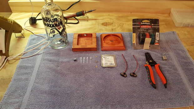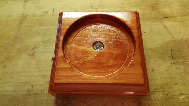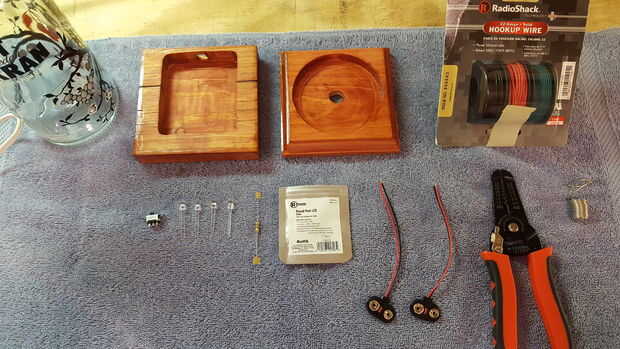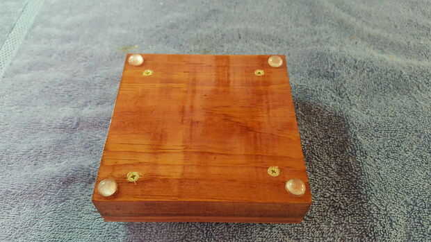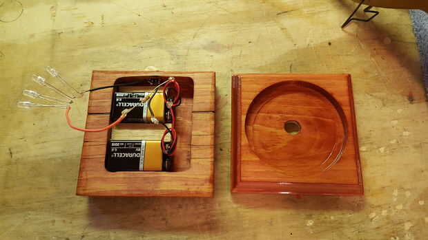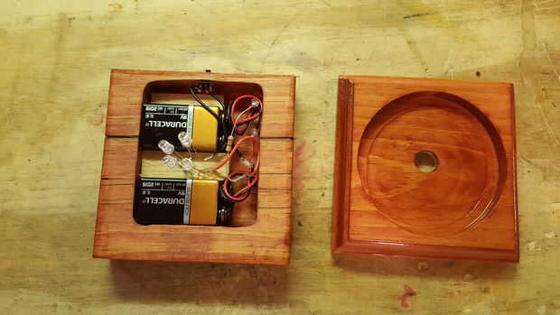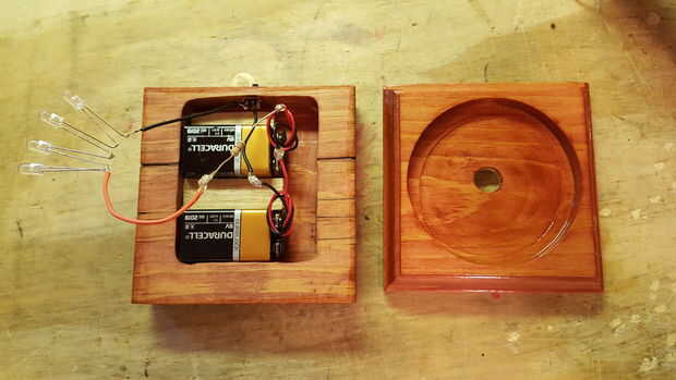 Una vez atado con alambre y comprobación para asegurarse de que el LED enciende, conecte las dos partes de la base Junta. Utilicé cuatro tornillos #4 1" latón madera de the Home Depot. Incluso los tornillos no están a la vista, me gustan los tornillos de latón ya que complementan el color rojo de la tinta para madera. Además, he añadido cuatro almohadillas de goma para el bajo parte de la base para evitar que estropeen o deslizarse sobre superficies duras. En el futuro, se pueden sacar los tornillos para reemplazar las baterías.