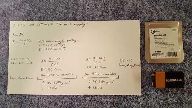 Una vez terminada la base, ahora usted puede conectar los componentes eléctricos. Dependiendo de cuantos LED y del tipo de pilas usas, tendrás que calcular usando R = V / I para saber que resistencia debo usar. Mostré mis cálculos en una foto por encima si no está familiarizado con esto. También, si no está familiarizado con el cableado eléctrico del LED a pilas, LEDs para principiantes es un gran instructable para seguir.