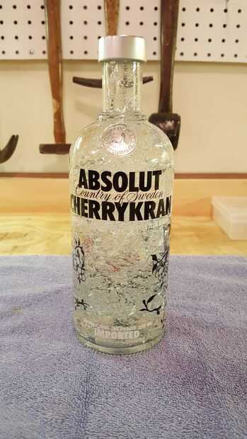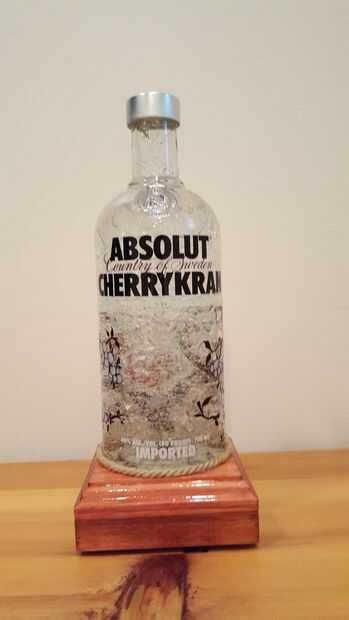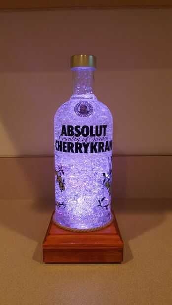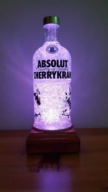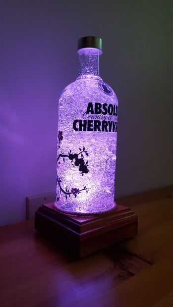 Decidí usar gel para el cabello claro dentro de la botella para dispersar la luz mejor. El gel para el cabello (ver lista) la consistencia de mantequilla de maní que hacía difícil colocar dentro de la botella. Usé un cuchillo de plástico y una goma pequeña espátula de cocina para lograr esto. Después de que la botella estaba llena, la coloqué en la base de madera. Yo iba a la pistola de pegamento caliente la botella a la base, pero la botella acabó siendo ajustado con el área que encamina hacia fuera para que el pegamento no era necesario.