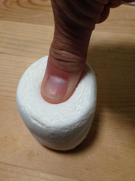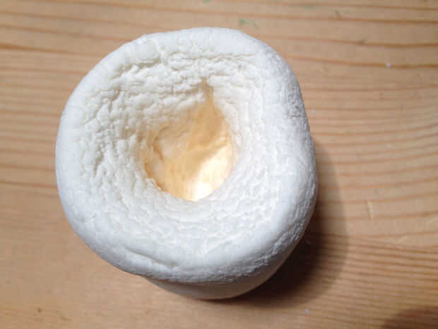 Asegúrese de que las manos estén completamente secas. Tomar uno de los bombones, se coloca en su extremo y presione su dedo pulgar en el centro. Entonces, comienzan su camino alrededor de la melcocha, agrandando el orificio empujando hacia abajo en el centro y tirando suavemente hacia fuera al lado. No desea romper o sobre estirar el malvavisco, sólo se intenta comprimir los lados para LED y batería.