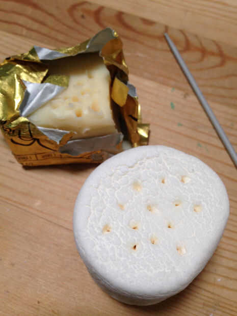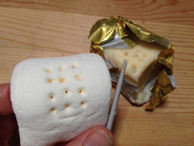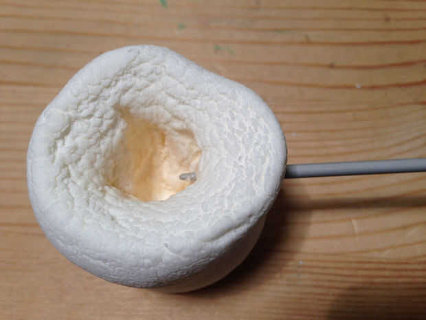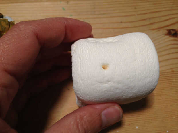 Coge tu aguja de tejer, u otro instrumento puntiagudo de su elección y comenzar a meter agujeros en los lados de su malvavisco para crear un patrón para la luz a través de. Empujar los agujeros en ángulo hacia su agujero interno, para que el extremo de la aguja es visible en el interior. Esto le permitirá más luz a través.